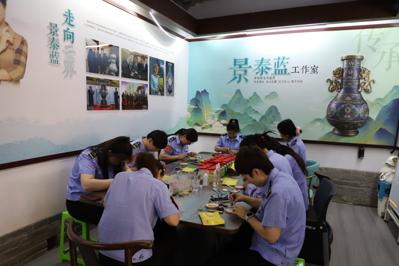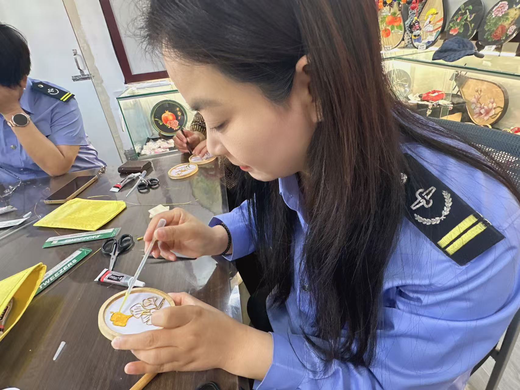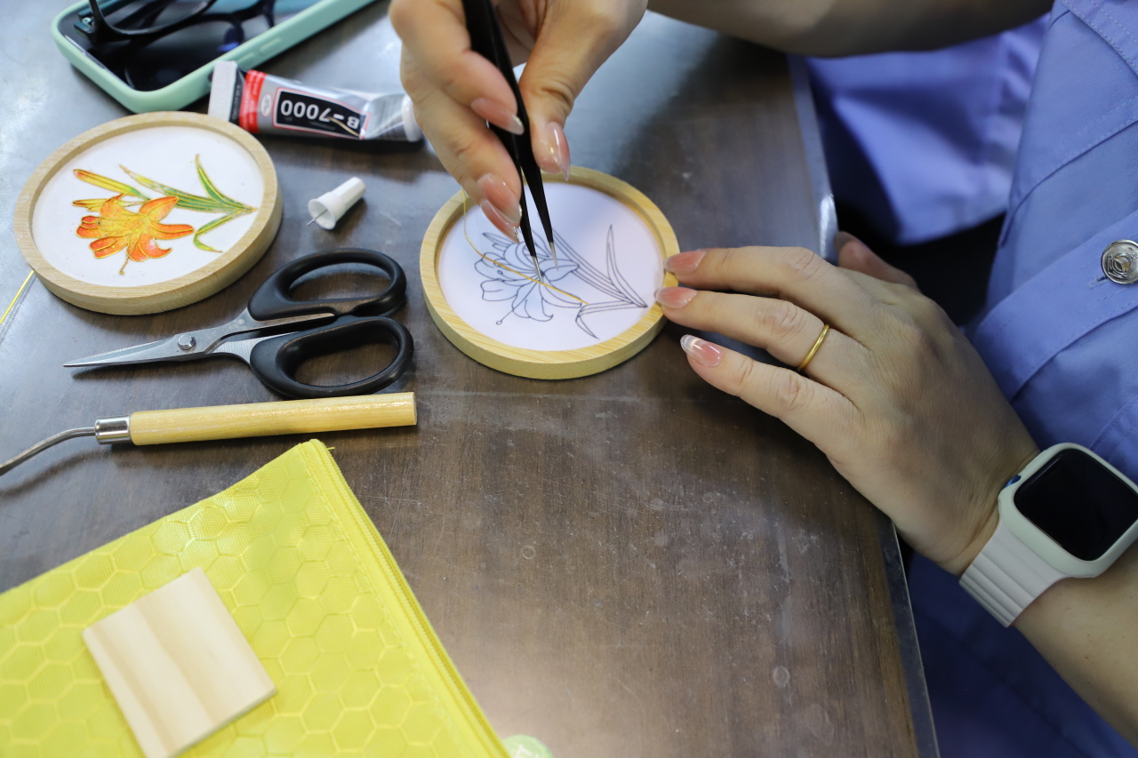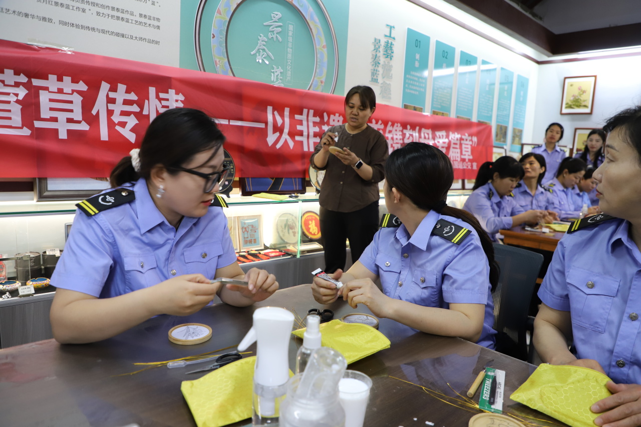 活动现场,景泰蓝掐丝珐琅工艺老师亲临指导,为女性职工们揭开这门千年技艺的神秘面纱。从裁剪柔软铜丝勾勒图案,到小心翼翼地将金丝嵌入画板,再到用彩砂填色、勾勒轮廓……每一个步骤都需要极致的耐心与专注。在制作过程中,大家相互交流、互相帮助,现场欢声笑语不断。